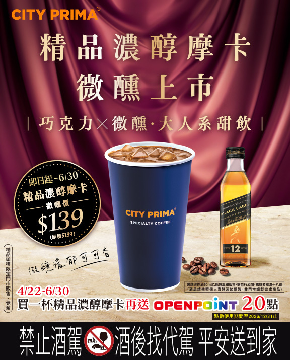 CITY PRIMA 精品濃醇摩卡 微醺上市!巧克力x微醺 大人系甜飲 微醺價139元/大杯(原價189元/大杯);買一杯精品濃醇摩卡再送OPENPOINT 20點(點數使用期間至2026/12/31止)